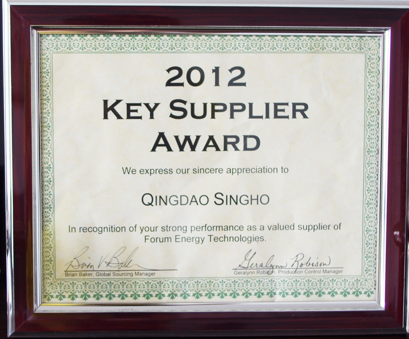 The highlight of meeting is that Qingdao Singho was awarded as KEY SUPPLIER of Forum Energy Technologies in recognition of Singho’s strong performance as a valued supplier of FET. We all at Singho are very proud of the Honour and meanwhile we are proud to be the reliable supplier and partner in China for Baker and FET about 10 years. We mainly supply the following finished parts to FET: Centrifugal Pump Parts such as Frame, Casing, Stuffing Box Cover, Bearing Cover, Bearing Housing etc/Mud Pump Parts such as Piston/Valve Parts such as Valve Body, Gate, Inserts, Locating Ring, Stem, Stem Housing, Stem Cap, Handles etc/Drilling Equipment Parts such as Safety Clamp Screw, Safety Clamp Nut, Slip Handle, Latch Lock, Spider Bushing, Insert Bowl etc.